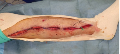 Figure 3. Left lower leg from which the great saphenous vein was harvested. Interrupted incisions that leave some skin prevent necrosis of the wound margin.