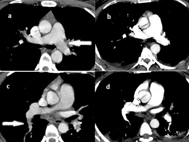 The patient had an adequate response to systemic thrombolysis. After the tPA infusion, oxygenation and blood pressures improved. The ratio of PaO2 to fractional inspired oxygen (FiO2) increased to 80 (PaO2 of 75 mm Hg and FiO2 of 93%) on the following day. Laboratory studies showed the patient's d-dimer level had decreased from >10000 ng/mL before treatment to 2653 ng/mL on the following day of thrombolysis. A posttreatment control CT revealed that the thrombi were successfully lysed (Figure 1B and 1D). The patient bled through abdominal drains and received an erythrocyte suspension transfusion along with 5 units of packed red blood cells and 3 units of fresh-frozen plasma over the course of 48 hours. On postoperative day 3, the bleeding had stopped and the drains were removed. The patient was discharged on rivaroxaban therapy for 6 months.