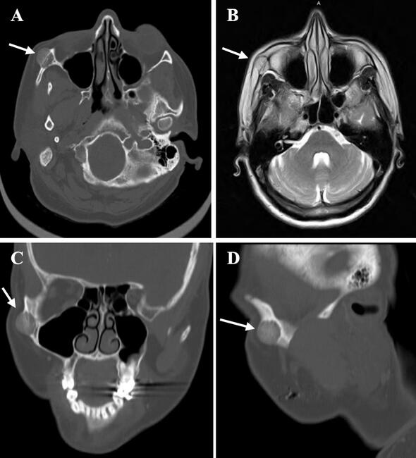 A 54-year-old otherwise healthy Caucasian female was referred to the otolaryngology head and neck surgery (OTOHNS) service due to a slowly progressive bony lesion of the right lateral malar crescent with poor cosmesis and noticeable asymmetry. Two years prior, the patient initially noted tenderness at the right malar eminence that became intermittently pulsatile. On physical examination, the patient had a slight protuberance at a 45-degree angle from the right malar eminence and inferolateral orbital rim junction. On palpation, there was a 2-cm firm, immobile mass. Given orbital involvement, referral to the University Oculofacial Plastics and Reconstructive Surgery service was made. Evaluation by the oculofacial plastics and reconstructive surgery (OPRS) service was congruent with the previous examination. Visual acuity was documented as 20/20 in both eyes, with an unremarkable ophthalmological examination.