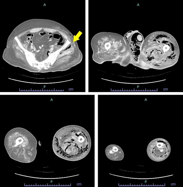 Figure 1. Computed tomography scans showing extensive gas images in the perifascial, intermuscular, and intramuscular regions, extending down from the left buttock (arrow) to the perineum, left thigh, and left lower leg.
