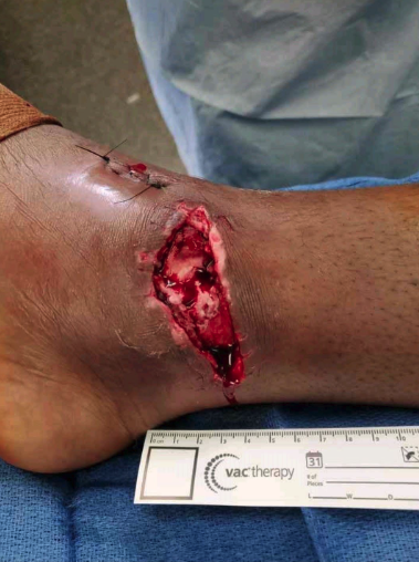 Patients with hematological syndromes who require major surgery need frequent observation throughout their hospital stay. This patient was monitored successfully with routine hourly flap checks for several days, Doppler monitoring over the vacuum tape, and visual assessment to ensure proper healing.8 The negative-pressure dressing allowed for sterile coverage and edema control over the ankle.9 Close monitoring in an established flap monitoring unit is critical to ensuring proper healing postoperatively.10