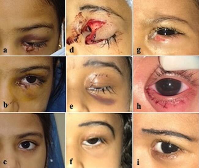 Figure 1. (A-I) A left lower lid avulsion from the medial canthus. (B) Follow up at first day of pigtail-assisted repair. (C) At 12 weeks. (D-I) Canalicular laceration (D-F, left upper; G-I, left lower) repaired in another 2 children by same technique with follow-up at postoperative day 1 and at 12 weeks.