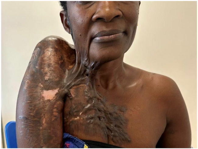 The patient was a 49-year-old female from Ghana, West Africa, and sustained an acid burn injury affecting her right neck, shoulder, axilla, and cheek in December 2020. As per the patient and her family, she spent 3 days at a local burn intensive care unit in Accra, Ghana, and was then treated with 1 month of conservative management. She received twice-weekly dressing changes and wound care during this time as she could not afford surgical management. The mentosternal contracture developed due to inaccessibility to definitive surgical care. In September 2023, she presented to our team with severe mentosternal (Type 3b) and right axillary contractures (Figure 1). The mentosternal contracture was causing a large impact on quality of life, so we addressed this contracture alone during this initial encounter. The injury led to substantial functional limitations including the inability to turn her head or lift her right arm. Ultimately, this impacted her employment, self-care, and ability to care for her family to the extent that her daughter had to quit school to care for her mother. The patient gave signed informed consent to publish her story and photographs.