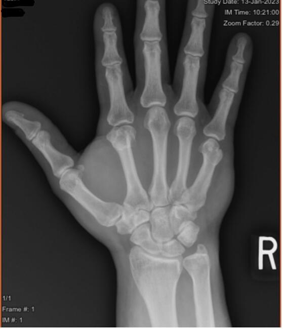 Figure 1. Preoperative posterior-anterior X-ray image of right hand with index finger metacarpal malunion.