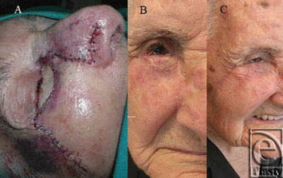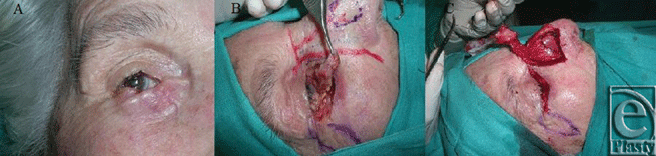 The narrow skin bridge created by the extensive lateral nasal incision and the medial extent of the lid resection was reinforced with the stitches from the medial extent of the transposition flap. Wound closure was accomplished by a simple discontinuous subcutaneous pattern (4-0 polyglactin), continuous cutaneous pattern for the transposition flap of von Langenbeck (5-0 nylon), and discontinuous cutaneous pattern for the rest (4-0 nylon). The results, just after (Fig 4A), 3 months after (Fig 4B), and 6 months (Fig 4C) after the surgery, were aesthetically and functionally excellent, and as we can see, with the absence of any malposition, entropion or ectropion. This patient had a good result probably due in part to her aged skin, so maybe the procedure described would be a good alternative just in old people but not in young people.