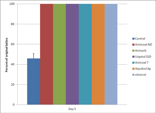 There were marked differences among the dressings in their abilities to facilitate wound healing (Table 3). This model has historically required approximately 22 days to achieve complete wound closure. In the open control group (comparable to the historic control), 30% of the wound remained open at 12 days. Actisorb and Acticoat Absorbent Absorbent-treated wounds were essentially healed by day 12. All of the silver-containing dressings except Contreet Foam and Acticoat Moisture Control appeared to greatly accelerate healing of these contaminated wounds. Actisorb began to separate from the other dressings in its healing trajectory by day 8.