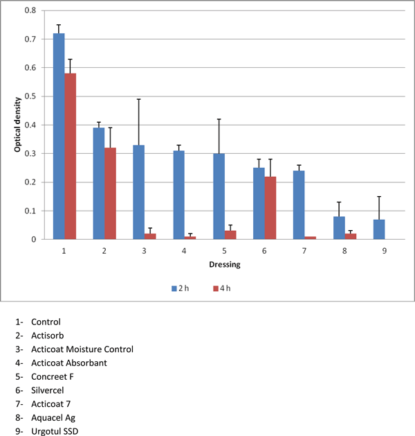 | Figure 2. Results of the MTT Assay demonstrating markedly decreased mitochondrial activity in fibroblasts exposed to silver-containing dressings. |