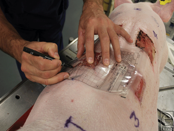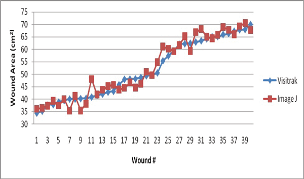 Porcine models with surgically created wounds already in use for alternative research were used for this study. A total of 40 wounds (4 wounds on 2 swine measured once a week for 5 weeks) were measured using 2 methodsVisitrak and photography combined with ImageJ software. Each wound was created as an 8 × 8 cm2 dissected to the paniculus adiposus. All were located on the dorsum of the animal to minimize surface curvature and allow ease of photography. During measurement, the animals were anaesthetized to minimize movement. On each occasion, they were placed in the same position under consistent lighting conditions. Prior to measurement and photography, the wounds were cleaned and slough removed to provide easily visible wound margins. For either technique, wound border tracing was done by the same operator in every instance.