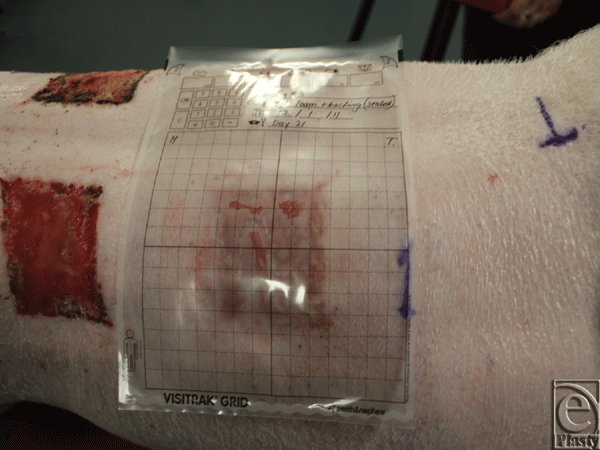 The wounds were also measured using Visitrak, a digital planimetry system. A 2-layered transparent Visitrak film was placed on the wound (Fig 1), and the outline traced onto the film using a permanent marker. The layer of the film in contact with the wound was discarded. The top layer containing the tracing was retraced onto the Visitrak digital pad using the Visitrak pen and the software calculated the wound area.
