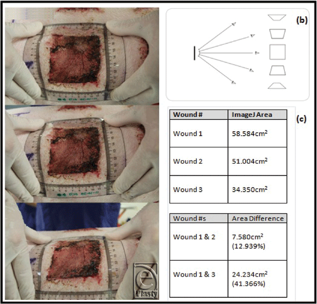 The aim of this study was to investigate whether a cheap, fast, easy, and widely available photographic method is an accurate alternative to Visitrak, when measuring wound area in cases where a nonwound-contact method is desirable.
