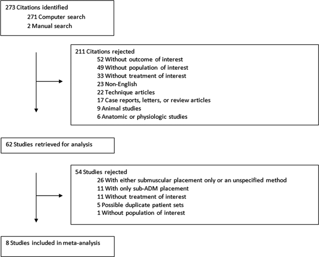 All studies included in the meta-analysis evaluate the rates of complications in ADM-assisted compared to traditional implant/expander breast reconstruction following mastectomy. All data were extracted directly from each study. Two researchers evaluated and independently extracted data from each study using a standardized form. The researchers were not blinded to the study being examined as this has been shown to be unnecessary.10