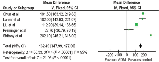 A forest plot of the OR of infection across all studies is provided in Figure 2. The meta-analysis reports over a 2-fold increase in rate of infections for the ADM-assisted group (OR of 2.33; 95% confidence interval [CI], 1.55-3.49). A forest plot of the OR of seroma formation across the 5 studies reporting this statistic is provided in Figure 3. There was a 3-fold increase in the incidence of seromas in the ADM-assisted group (OR of 3.00; 95% CI, 1.96-4.61). A forest plot of the OR of tissue expander explantation across all studies is provided in Figure 4. The meta-analysis reports over a two-fold increase in rate of explantations for the ADM-assisted group (OR of 2.41; 95% CI, 1.59-3.64). A forest plot of the mean difference of intraoperative fill volumes of the tissue expanders is provided in Figure 5. The meta-analysis reports a mean difference of 162 mL (95% CI, 148-177)