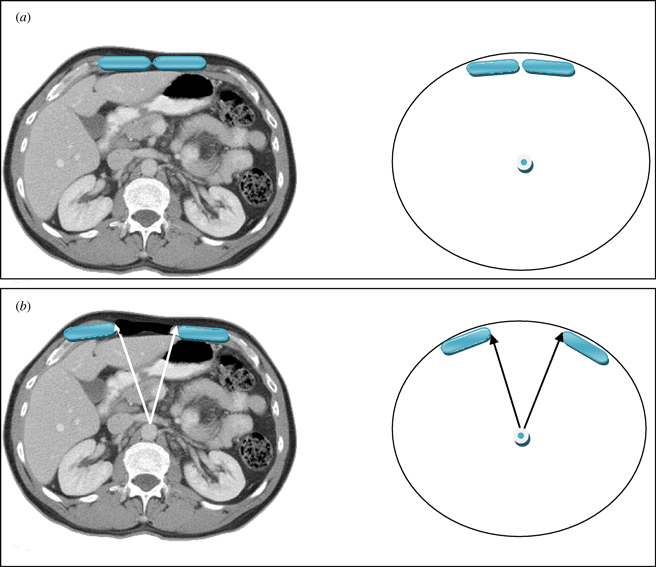 A retrospective review of all patients undergoing ventral hernia repair were included in the study in accordance with the patient population of the senior authors (M.C., E.R). Approximately 80% of the ventral hernia patients had a CT scan performed preoperatively and had identifiable medial edges of the rectus abdominus muscles allowing for a calculation of angle of diastasis. We reviewed operative reports of all patients included in the study. Two groups were created on the basis of type of ventral hernia repair. Group 1 consisted of patients that required component separation alone without the use of interpositional mesh (n = 18). Group 2 consisted of all patients requiring interpositional mesh in addition to component separation (n = 18). Approval of institutional review board was obtained for evaluation of CT scans and review of operative reports in accordance with the guidelines set forth by the University of Maryland Medical Center/R Adams Cowley Shock Trauma Center institutional review board.