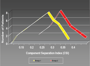 Scar tissue that develops between the layers of the myofascial envelope of the abdominal wall will likely change the differential distances one can achieve with an abdominal component release. The CSI is limited in that it will not account for this variable. Our goals were to review the large ventral hernias seen in our trauma center and find an objective method to predict whether we would need to perform only a component separation versus a component separation with use of interpositional mesh (consisting of an acellular dermal matrix with or without a composite of prosthetic mesh). There are limitations with the CSI value. Certainly with these cases, there may be changes in the original surgical plan as scarring of the rectus muscles and between the rectus fascia and the overlying soft tissue envelope can be extensive. This may limit advancement of the myofascial components toward the midline. Loss of domain also plays a role in the algorithm. Increase of intraoperative peak airway pressure may alter the original plan of component separation to the addition of interpositional repair. The CSI represents a percentage loss of abdominal domain specific to each patient's body habitus. The CSI takes into account the size of the hernia defect relative to the remaining tissue present in the abdominal wall. The calculated value serves as an accurate biometric assessment of the abdominal wall defect rather than an absolute value of the distance between leading edge of rectus muscle and the area of the defect. By creating a value that correlates defect size to each patient's unique biometric profile, we create a standardized value that allows for true comparison. Postoperative recurrence rates were also evaluated in our patient population. Not surprisingly, we found that there is also an association with the CSI angle of diastasis and the rate of hernia recurrence.