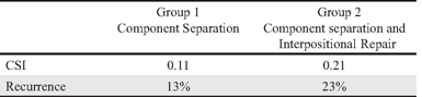 | Figure 3. Group 1 and group 2 CSI values and ventral hernia recurrence rate. |