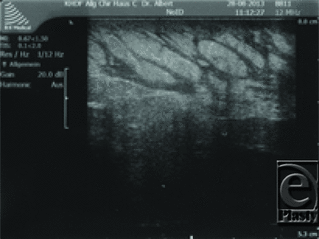 Since the elephantiasis was progressive despite intensified DLT, we decided to do debulking surgery in general anesthesia. Her ASA score was class II.14 Preoperative sonography of elephantiasis demonstrated disseminated fat vacuoles with a circumscribed pool of fluid in a depth of 4 to 7 mm (Fig 6).