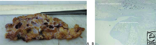 The histological preparation revealed fibrotic tissue, ectatic blood, and lymphatic vessels. A large pseudocyst was seen without any endothelial component but podoplanin positive lymphatic spaces within its thick wall (Fig 3c). Ectatic vessels were podoplanin negative on the inner surface.