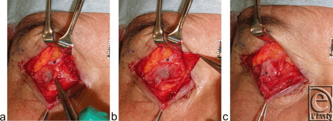 | Figure 4. Surgical procedures (refer to Fig 1b). (a) Disinserting Müller's muscle from the tarsus. (b) The globe is visible through the conjunctiva palpebrae. (c) The disinserted aponeurosis is fixed to the tarsus with 3 stitches. Asterisks indicate the levator aponeurosis. |