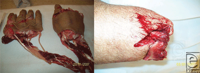 This photo series was e-mailed from a remote, referring ER, preparing to transfer the patient via fixed-wing aircraft during inclement weather for replantation. The avulsive and multilevel nature of this injury precludes replantation. The proximal stump retained sufficient soft tissue for closure without complex tissue rearrangement. Unnecessary transfer was averted on the basis of these 2 e-mailed images (Fig 2).