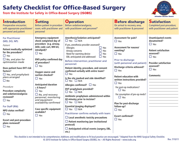 The implementation of this checklist requires a substantial input of time and effort on the part of every member of the office-based practice. Because it is customizable, the checklist invites input from a multidisciplinary team. By providing a framework for the safe, ideal office-based surgical procedure, the checklist reveals deficiencies and triggers direct and indirect improvements in the provision of safe care. This study shows that the use of a customizable, office-based surgical safety checklist is associated with improvements in safety measures, documentation, and a reduction in complications in a practice with an already high baseline standard of care.