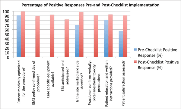 All recorded complications were classified into 12 categories (seroma formation, uncontrolled pain, bleeding, rash, nausea/vomiting, emergency medical services activation, hypotension, infection, neurologic deficit, hyperglycemia, death, and reoperation). The number of each complication per 100 patients and the proportion of patients with one or more complications were reported. The Pearson chi-square test or the Fisher exact test were used to compare prechecklist and postchecklist implementation where appropriate. Absolute risk reduction was calculated to quantify the checklist's effect on complication rates. Using an alpha level of .05, a 2-sided likelihood ratio test yielded a power of .976. SAS 9.3 was used for statistical analysis.