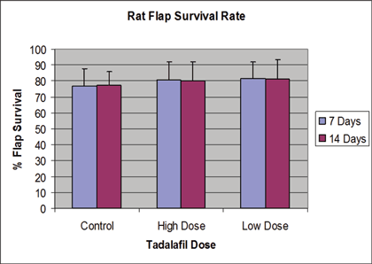In our experience, we attribute the high standard deviation to several identified problems with the current study and studies like it. First, McFarlane flaps are very difficult to reproduce consistently. The dorsal rat skin is extremely mobile and very thick. The act of incising the skin frequently distorts the flap pattern. Second, administration of tiny doses of tadalafil is very imprecise. The amount of compound that is actually administered to the rats given the large fraction that remains in the dead space of the syringe and gavage needle is inconsistent. Third, transfer of the flap pattern and line of demarcated necrosis onto the transparency paper is approximate at best. Given these limitations, we suggest further study to examine the effect of daily oral administration of tadalafil. While our results are suggestive, they are not conclusive and warrant further investigation into the potential therapeutic use of the PDE-5 inhibitor, tadalafil.