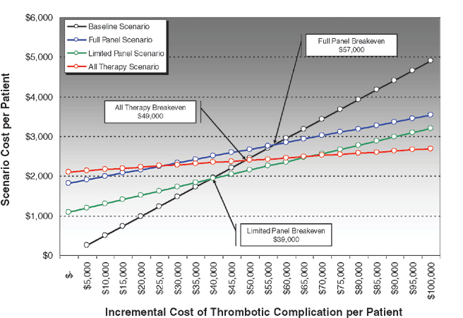 | Scenario | Cost per Patient | Thrombotic Complications | Break-Even Point | ICER | |||