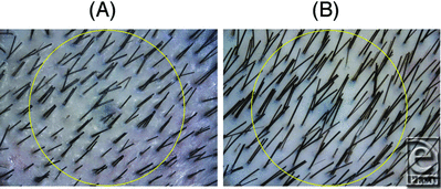 The intersection of a line extending cranially from the lateral angle of an eye (left or right) and a line connecting both ears coronally was marked on the scalp with tattoo. A circle 2 cm in diameter centered on this mark was shaved. TrichoScope images were recorded using a PowerShot 450 digital camera (Canon, Tokyo, Japan). The number of hairs within a circle of 11 mm in diameter (area, 95 mm2) centered on the tattoo was counted by 2 technicians blind to the patients, and the average number was recorded as data. Trichograms were made before starting treatment and at 1 to 3 months after the final treatment (7 to 12 months after initial treatment).