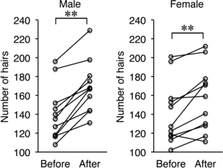 | Figure 2. Changes in the number of hairs before and after treatment in male and female patients. *P < .01. |