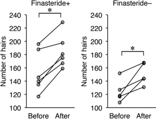 | Figure 3. Changes in the number of hairs before and after treatment in male patients with or without finasteride administration. *P < .05. |