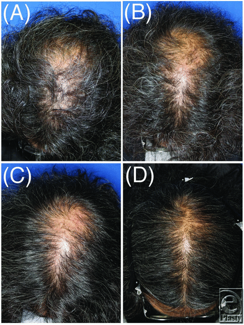 We used a commercial product containing protein solution from adipose-derived stem cell-conditioned medium (AAPE; Prostemics, Seoul, Korea), as previously described.6,7 AAPE® was well studied in the previous report and it contains various growth factors or cytokines such as hepatocyte growth factor, fibroblast growth factor–1, granulocyte colony-stimulating factor, granulocyte macrophage-colony-stimulating factor, interleukin 6, vascular endothelial growth factor, and transforming growth factor β3.8 Intradermal injections with a 31-G needle provided about 0.02 mL/cm2 of solution. A total volume of 3 to 4 mL was injected during each session of treatment. Patients received treatment every 3 to 5 weeks for a total of 6 sessions. Finasteride was also administered to 6 male patients, but no female patients, during the study.