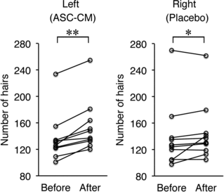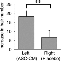 In the half-side comparison study, the number of hairs was significantly increased after treatment on both the left (adipose-derived stem cell-conditioned medium) and right (placebo) sides (Fig 6). However, the increase in the number of hairs was significantly higher on the left (adipose-derived stem cell-conditioned medium) side than on the right (placebo) side (Fig 7).