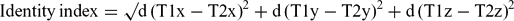 Table 2 shows 3D coordinate values of landmark locations and identity indices (identical twins only), and Table 3 shows 3D coordinate values and identity indices between new identity resulting from facial allotransplant and native identity, while Table 4 shows values of shape of family phenotype and family identity pool. Measurement errors of intraobserver precision were 1.1 mm, 1.0 mm, 1.3 mm for the x, y, and z coordinates, respectively; it was 1.4 mm for linear measurements. No statistical difference was detected between original and repeated measurements.