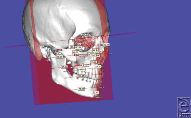 Software (Surgicase, Materialise, Plymouth, Michigan) allowed creating a template of landmark locations, (Table 1) and measurements were recorded between them. Three-dimensional (3D) spatial coordinate system was defined by using 4 landmarks: nasion, basion, prosthion, and sella. The y-z plane passed through nasion, basion, and prosthion in midline, x-y plane was perpendicular to y-z plane, passing through nasion and sella while z-x plane was perpendicular to y-z and x-y planes, passing through basion.