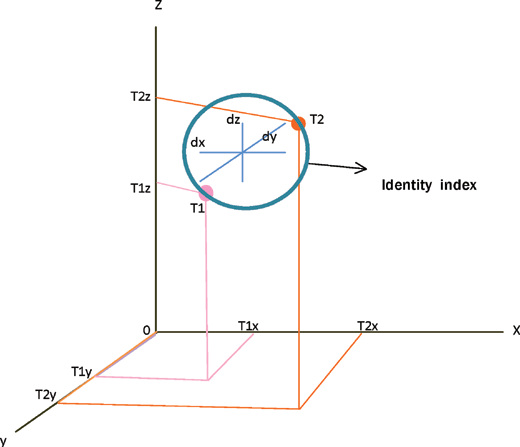 X-axis was determined roughly parallel to right-left direction of subject's maxillofacial skeleton. Y-axis and z-axis corresponded to anterior-posterior and inferior-superior directions, respectively. Three-dimensional coordinate values (dx, dy, dz) were calculated for landmarks Bc, Pr, and Mx with origin (0, 0, 0) set at Ba. For Pr, only y- and z-axis values while for bilateral landmarks, x-axis (horizontal difference between 2 landmarks), y- and z-axis coordinate values (average of right and left side values) were measured (Fig 1). Displacement vector was calculated as the difference between 3D coordinate values of a twin pair (T1, T2) and was named as identity index for that particular landmark location (Fig 2).