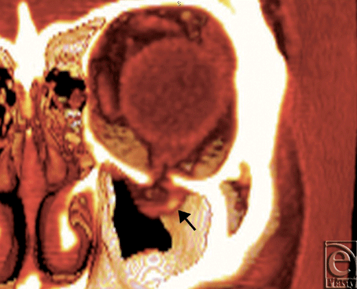 | Figure 2. An orbital floor fracture case with a strangulating inferior rectus muscle (black arrow). |