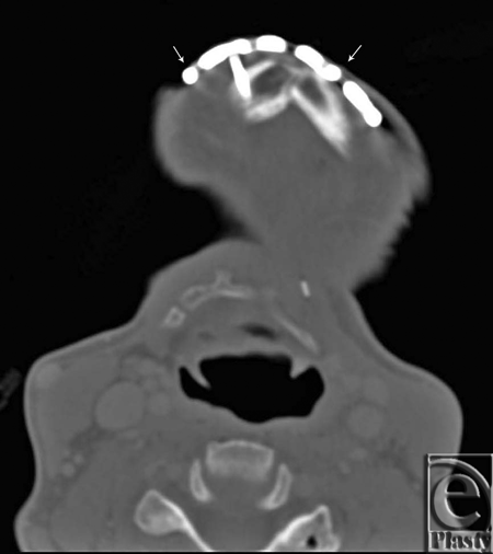| Figure 3. Preoperative computed tomographic scan. Arrows indicated where cuts were made with large surgical pin cutters to remove the exposed portion of the reconstruction plate. |