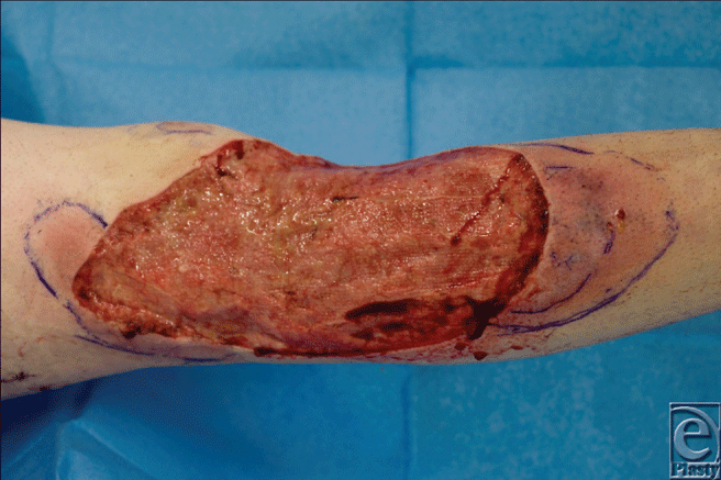 J.W. was a 33-year-old male IT analyst whose medical background included ulcerative colitis for which he was on pentase and predfoam enema. He was referred by the general practitioner (family physician to the emergency department with a 1-week history of an erythematous wound to his right lateral leg with no improvement on oral flucloxacillin. Hospital review revealed development of a localized abscess, and associated inflammatory markers included a White cell count (WCC) 13.4 and Creactive protein (CRP) 179. Subsequently the patient was admitted by the orthopedic team and treated with intravenous antibiotics (benzylpenicillin, flucloxacillin, and metronidazole). Four days later he underwent incision and drainage where the operative findings confirmed blood stained pus. Two days later, an increase in the WCC to 20.3 and CRP to 283 was observed and a further debridement of a 25 × 15-cm area was undertaken where a bubbly appearance of the margins, extensive erythema and necrosis of the skin distal to the wound, discharge and fat necrosis were noted. Histology confirmed inflammation with necrosis of the tissues, but Gram stain showed no specific organism and wound swabs only grew coagulative negative Staphylococcus. The case was discussed with the microbiologists who recommended treating the patient with a provisional diagnosis of NF. However, as there was no clinical improvement at this stage, he was referred to our burns and plastic surgery department. An assessment in theatre found purple borders around the wound, and subcutaneous pockets of pus which discharged on palpation. Histology confirmed an ulcer and abscess with acute inflammation and fibrosis and granulation tissue which extends to the margins with no vasculitis or neoplasia. Microbiology failed to show any growth. Based on these clinical findings, histology, and microbiology, a diagnosis of PG was made and the patient was commenced on prednislone 40 mg. Subsequent review revealed improvement within 48 hours with no extension of the wound, and the patient went on to have a split-skin graft to cover the previous defect with subsequent full recovery (Fig 1).