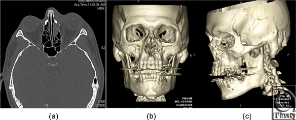 | Figure 3. Postoperative maxillofacial computed tomographic scan with 3D reconstruction (a) axial view, (b) anteroposterior 3D view, (c) oblique 3D view. |