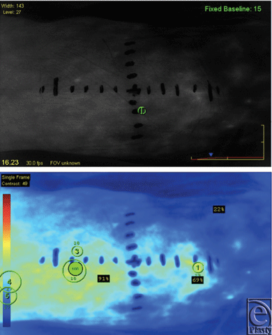 The SPY system (Novadaq Technologies, Inc, Concord, Ontario, Canada) was originally developed to evaluate patency of coronary artery bypass grafts, with the approval of the Food and Drug Administration expanded to plastic surgical procedures in 2007. For breast reconstruction, the SPY system has been proposed to aid in perforator identification, evaluation of tissue perfusion, and predicting potential regions of tissue necrosis.2,3 The SPY-Q analysis program can quantify relative and absolute tissue perfusion parameters based on the absorption patterns of light emitted from ICG, which is directly bound to intravascular proteins within the near-infrared spectrum.4