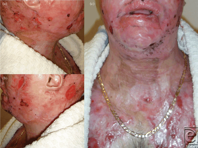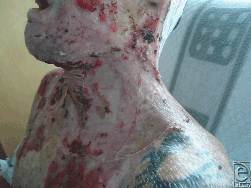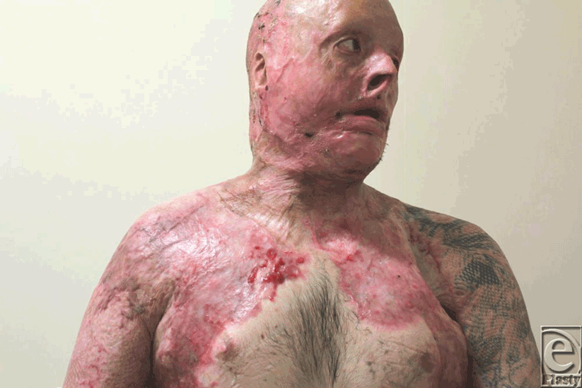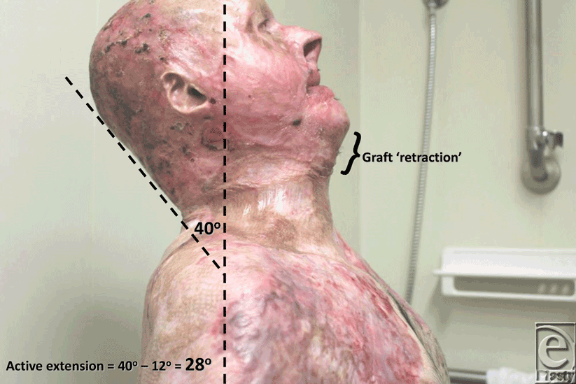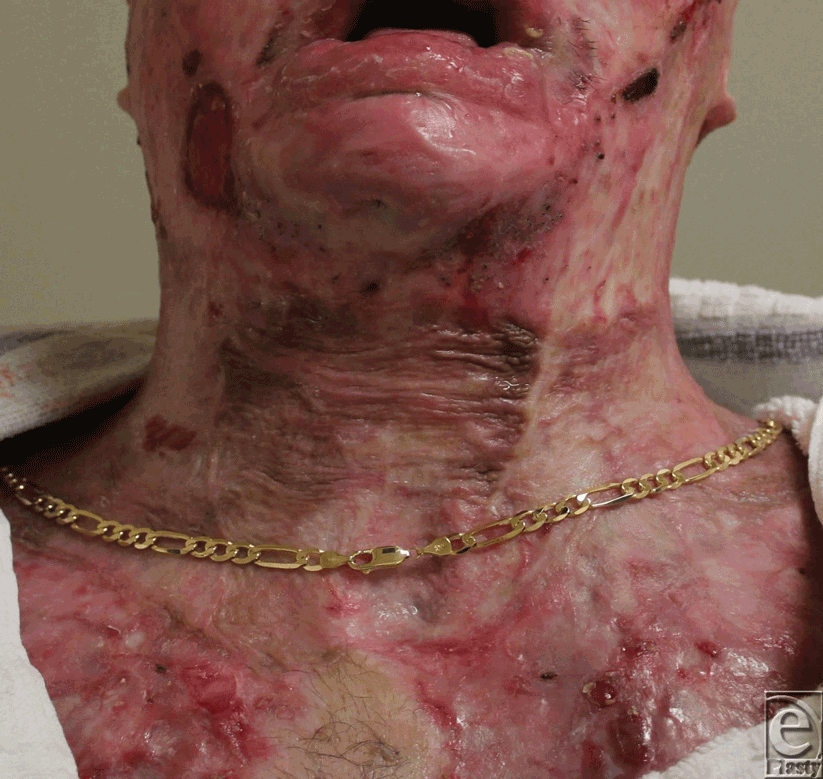 Our patient is a male, involved in a car rollover and fire, in which he was trapped for some time. He sustained full-thickness burns to face and neck, upper anterior and posterior torso, and both upper limbs completely (35% total body surface area). He had an extremely significant inhalation injury, which necessitated 6 weeks of intensive care unit (ICU) admission, with intubation followed by tracheostomy at 2 weeks. His burns were excised from his upper limbs, chest, back and shoulders immediately on arrival (within 12 hours of his burn injury) and grafted successfully. As is our policy, the facial and neck burns were initially treated conservatively although the head burns were excised 2 days later and grafted. He developed vancomycin-resistant enterococcus (VRE) and methicillin-resistant Staphylococcus aureus (MRSA) on ICU and the development of his lower airway chemical pneumonitis precluded further acute intervention. He struggled physiologically for several weeks before being fit for discharge from the ICU to the burns unit.