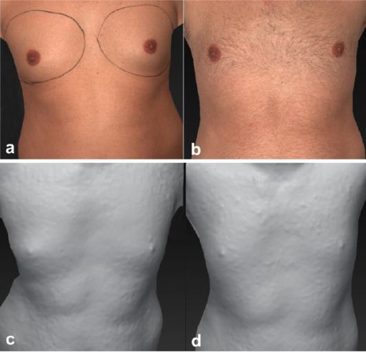 Methods. A total of 9 male patients diagnosed with pseudogynecomastia underwent laser procedure with a Nd:YAG laser emitting at 1444 nm. The goal was to generate adequate heat propagation and thermal action in the dermis as homogeneous as possible to induce fat cell lipolysis. The results were clinically evaluated by comparing pictures at baseline and 4 months later.