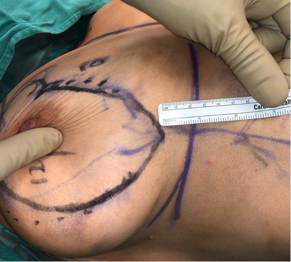 The first step was placement of the inferior skin margin 2 cm above the IMF (Figure 1), which correlates with placement of the NAC 2 to 3 cm above the level of the IMF (Table 1). Intraoperatively, tumescent fluid was infiltrated into the tissue to be excised to both aid in hemostasis and increase overall breast tissue turgor to assist in resection and de-epithelization of the pedicle, respectively. The skin around the NAC and overlying the pedicle was de-epithelialized, and the vertical limbs were incised. The breast tissue inferior to the pedicle was excised, both within the horizontal aspect of the vertical limbs, as well as medial and lateral to the limbs, down to the level of the IMF.