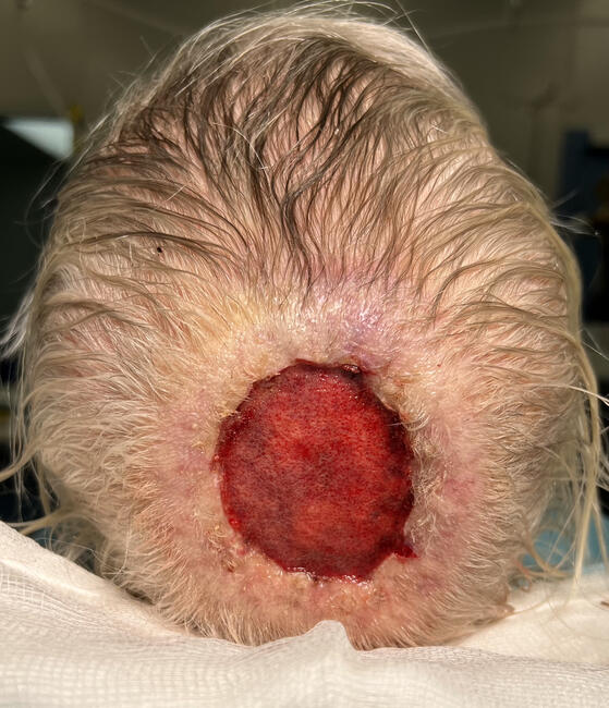 Figure 4. Patient 9, who underwent excision of basal cell carcinoma after burring of the outer table of the cranium, shown 4 weeks post-application of the biodegradable temporizing matrix at the vertex of the scalp.