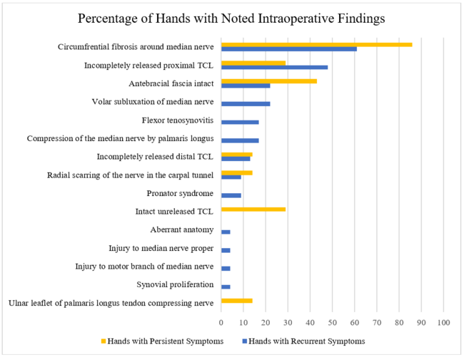 Hands that experienced persistent carpal tunnel syndrome following index release had a distribution of intraoperative findings that was similar to that of the recurrent group. However, a greater percentage of these hands were found to have a completely intact and unreleased TCL compared with the recurrent group (29% vs 0%, respectively). Conversely, all of the hands that were found to have a completely intact and unreleased TCL had persistent symptoms.