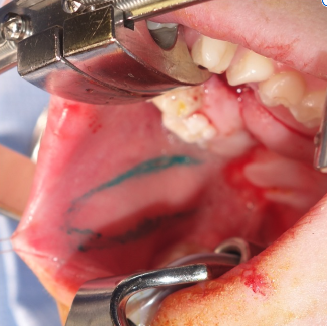 Figure 2. Intraoperative view of a buccal myomucosal flap design, based in the retromolar trigone and extending toward the oral commissure, positioned inferior to Stenson’s duct.