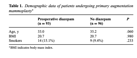 Methods/Technique: A retrospective review was conducted of 189 patients undergoing primary breast augmentation at an outpatient surgical center from 2012 to 2015. Patients receiving same-day premedication with oral diazepam were compared with a control group without premedication. Patients with combined surgical procedures were excluded with the exception of minor, superficial procedures. Patient demographics, perioperative medication use, operative details, and postoperative numeric pain scale (0-10) scores were collected.