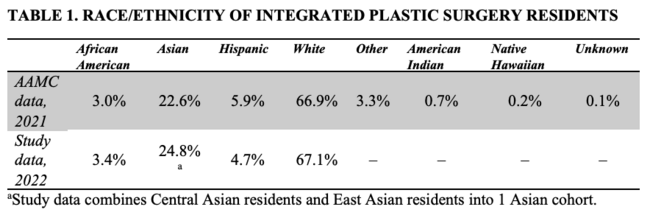 Methods. A cross-sectional study of US integrated plastic surgery residency programs was performed in August 2022. Data on race were collected for residency program directors and resident cohorts and compared with self-reported data from the Association of American Medical Colleges (AAMC). Relationships between these groups were analyzed.