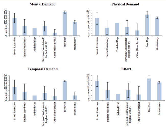 Methods. In this prospective study of plastic surgery breast procedures over a 3-month period, surgeon and patient demographics and procedural details were collected. The lead surgeon assessed each procedure using a validated workload questionnaire (National Aeronautics and Space Administration Task Load Index [NASA-TLX]) that included 6 subscales (ie, mental, physical, temporal demand, performance, effort, and frustration), a question on distraction, and their expectation of procedural difficulty.
