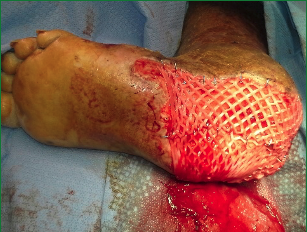 Parameters used to ascertain readiness for STSG included healthy granulation tissue devoid of scar tissue, eschar, or infection (Figures 3 and 4). No histologic nor biopsy data was obtained, and the decision to proceed to skin graft was made based on clinical grounds alone. Once seen in the office and interval STSG was booked and performed (Figure 5), patients were again discharged to an SAR facility or home after 4 days of the same NPWT (Figure 6) with visiting nurse services. Postoperative appointments were scheduled for 1 to 2 weeks after STSG. The general follow-up schedule in the office was every week thereafter for both the application of FBD and STSG, although outcome variables were assessed at the first postoperative visit despite the variation in actual days since the intervention.